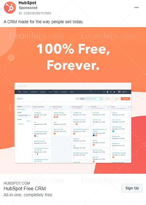 Why It Works: HubSpot’s ad focuses on the value of its free CRM. The simple, direct messaging (“it works for you and it’s free”) effectively grabs attention and lowers the barrier for users to try it out. Offering a free version of the software through Facebook ads is a great way to generate interest and lead conversions, especially for budget-conscious users.