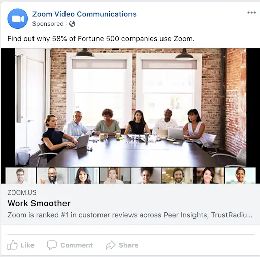 Why It Works: Zoom’s ad uses the power of social proof, pointing out that 58% of Fortune 500 companies use their product. This statistic establishes credibility and trust while addressing a key pain point for businesses—efficient remote communication. The minimalism of the design, combined with powerful statistics, helps the ad stand out.