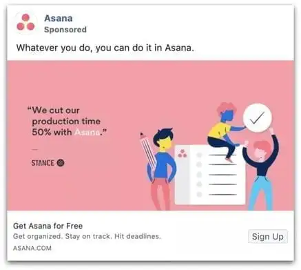 Why It Works: Asana’s ad excels by using video content to visually demonstrate its functionality. The clear and inviting CTA, “Try for Free,” immediately engages users and reduces any hesitation to take the next step. The video highlights Asana’s practical uses while maintaining a creative edge, making it both engaging and informative.