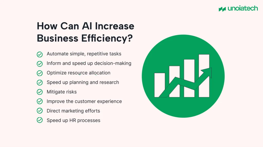 - Improved operational efficiency: AI helps identify and eliminate inefficiencies, allowing businesses to reduce repetitive tasks and increase productivity.