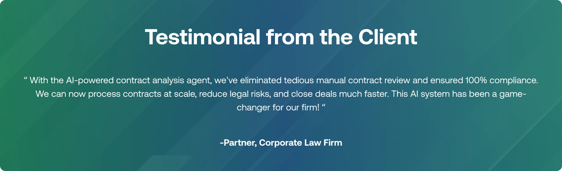 “With the AI-powered contract analysis agent, we’ve eliminated tedious manual contract review and ensured 100% compliance. We can now process contracts at scale, reduce legal risks, and close deals much faster. This AI system has been a game-changer for our firm!”