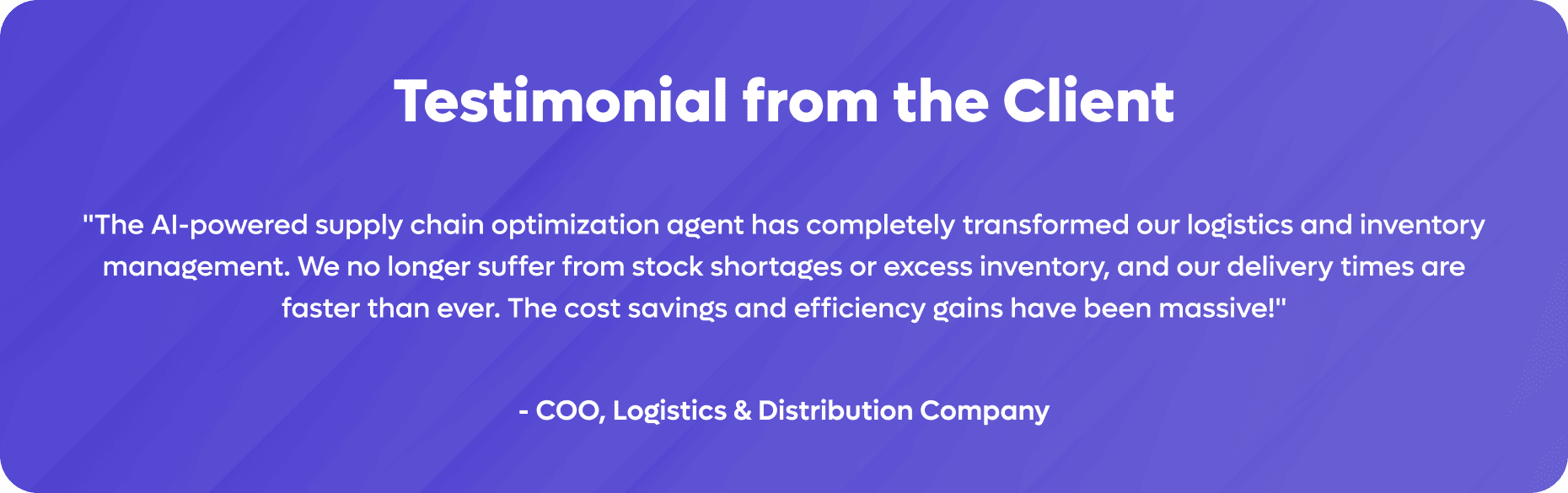 “The AI-powered supply chain optimization agent has completely transformed our logistics and inventory management. We no longer suffer from stock shortages or excess inventory, and our delivery times are faster than ever. The cost savings and efficiency gains have been massive!”