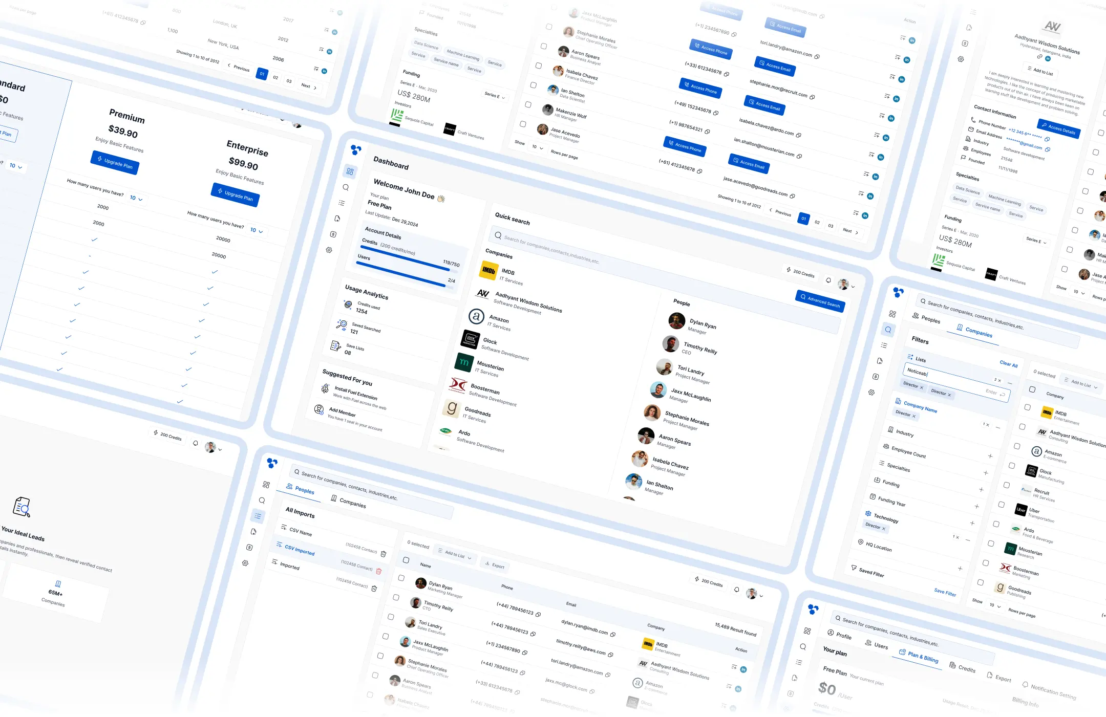 To create a seamless and user-friendly experience, we started with low-fidelity wireframes to define the layout and structure of the platform. Our focus was on intuitive navigation, easy access to data, and a clean interface to simplify lead discovery. We refined the workflows to reduce complexity and enhance efficiency.