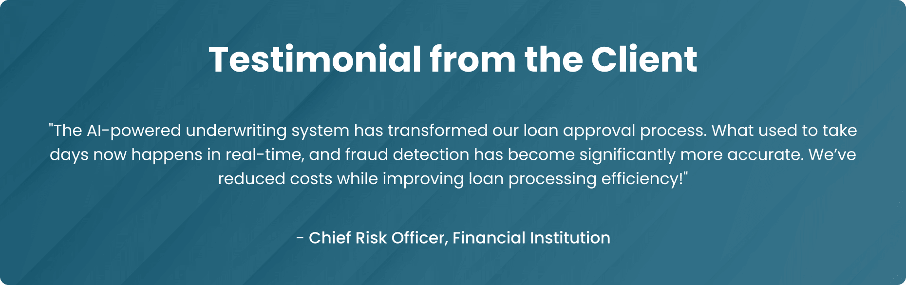 “The AI-powered underwriting system has transformed our loan approval process. What used to take days now happens in real-time, and fraud detection has become significantly more accurate. We’ve reduced costs while improving loan processing efficiency!”