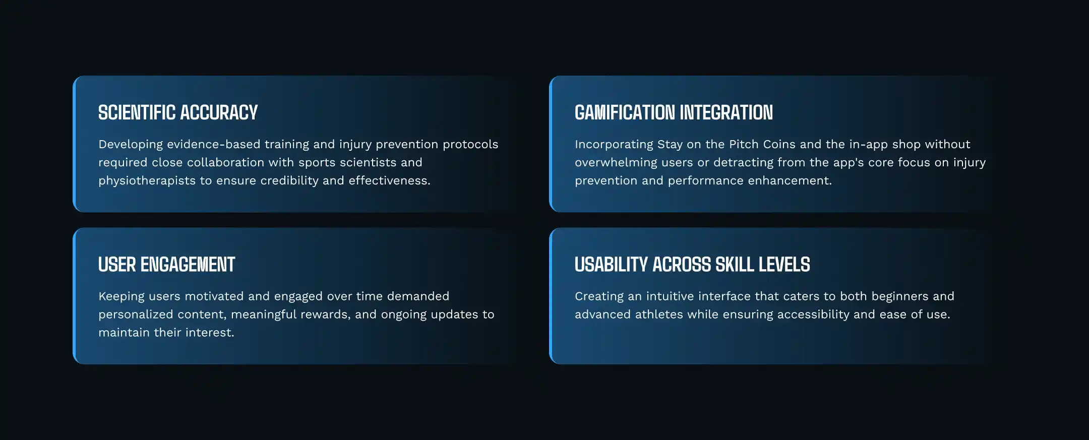 Key challenges included designing a user-friendly interface for athletes of all levels, ensuring scientifically accurate training protocols, integrating gamification seamlessly, and maintaining long-term user engagement.