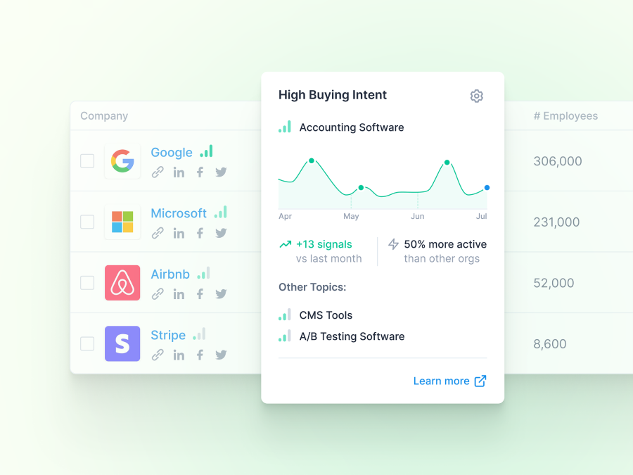 - Tracks over 150 data attributes that customers can use to sort prospects, such as by title, revenue, location, number of employees, VC funding, and more.