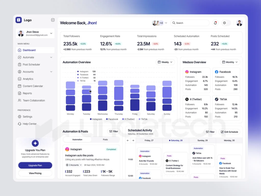 The social media dashboard centralizes performance metrics across all social media channels, allowing agencies to demonstrate growth and engagement to clients. With real-time tracking, agencies can show clients the value of their campaigns, enhancing trust and transparency. By accessing insights in seconds, clients are reassured of continuous social media efforts without needing additional presentations. Key metrics include: